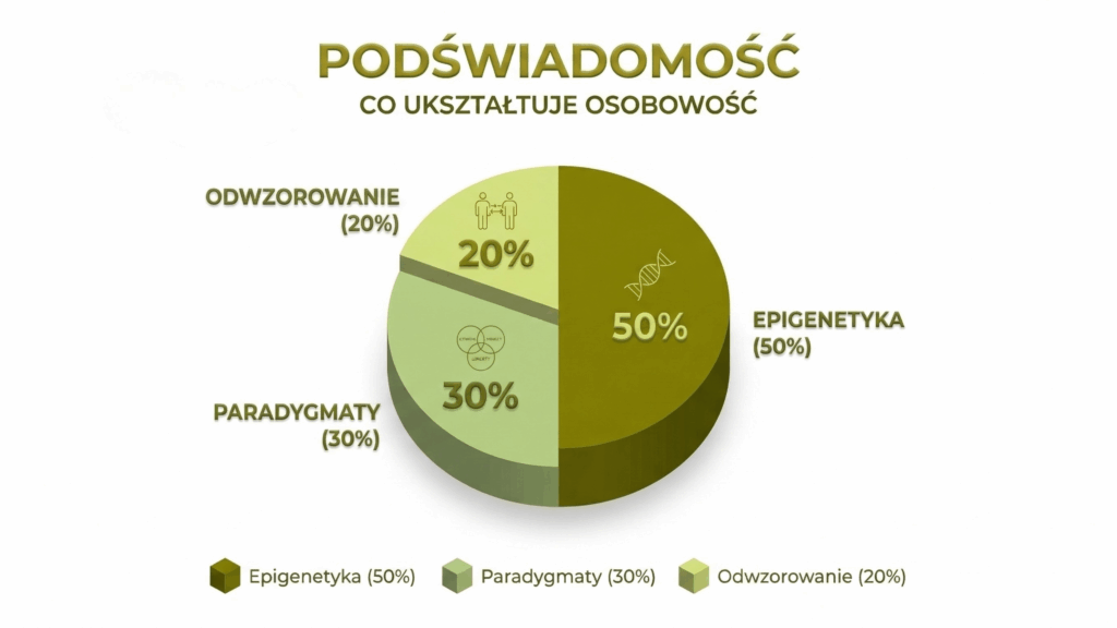 - 60% to epigenetyka – emocje i schematy odziedziczone nawet od 3-4 pokolenia wstecz.